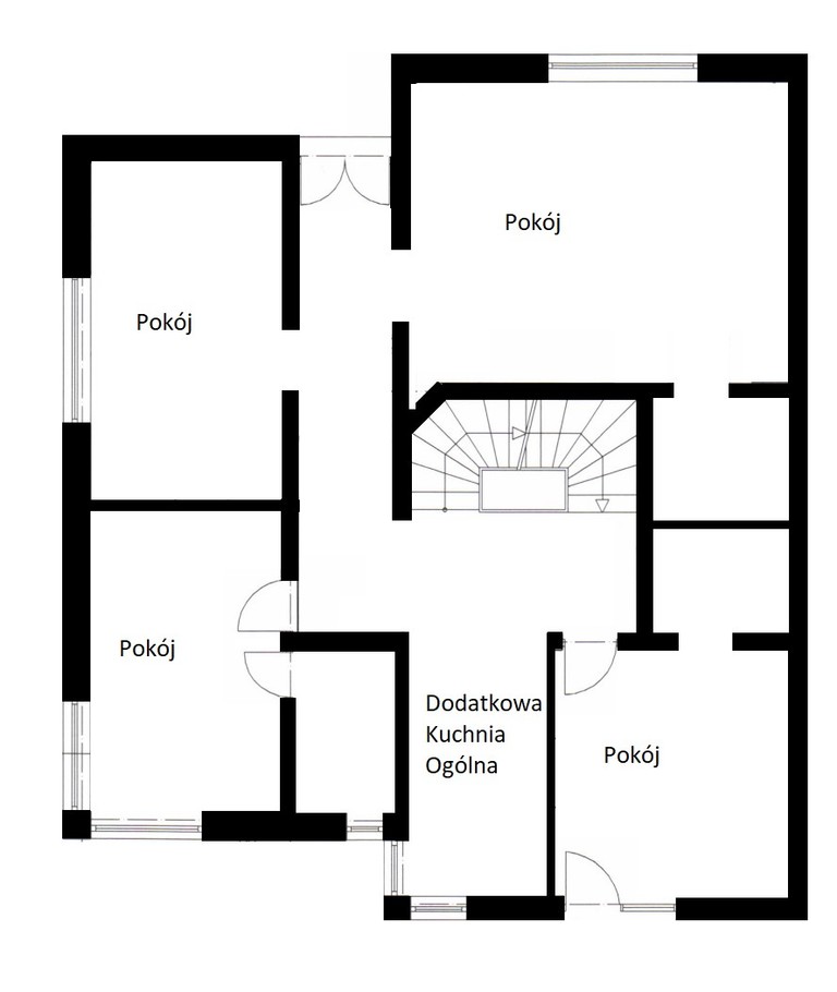 - 1 piętro: cztery pokoje oraz ogólnodostępna dodatkowa kuchnia