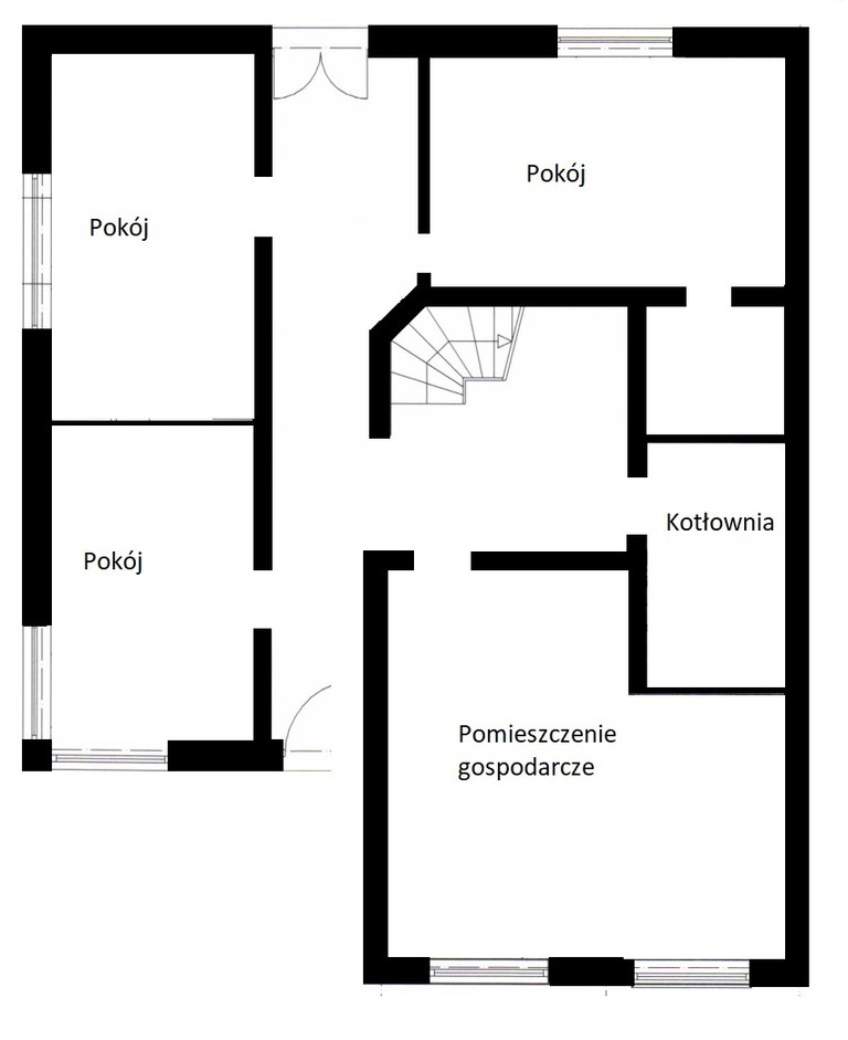 - parter: trzy pokoje, kotłownia, pomieszczenie gospodarcze