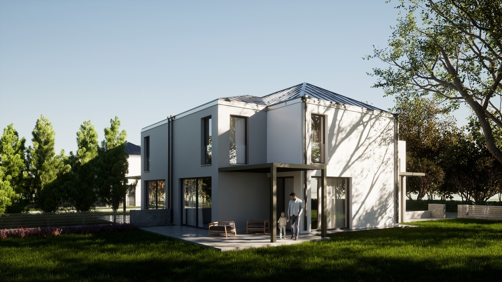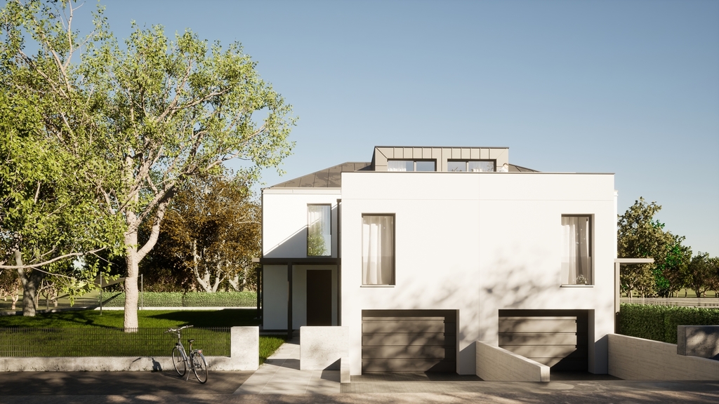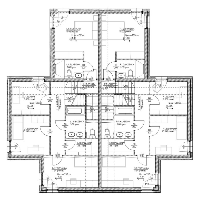 Kondygnację piętra również ukształtowano na dwóch poziomach – na półpiętrze zlokalizowano główną sypialnię z prywatna łazienką, natomiast na głównym poziomie piętra zaprojektowano dwie sypialnie, gabinet, pomieszczenie gospodarcze oraz łazienkę.