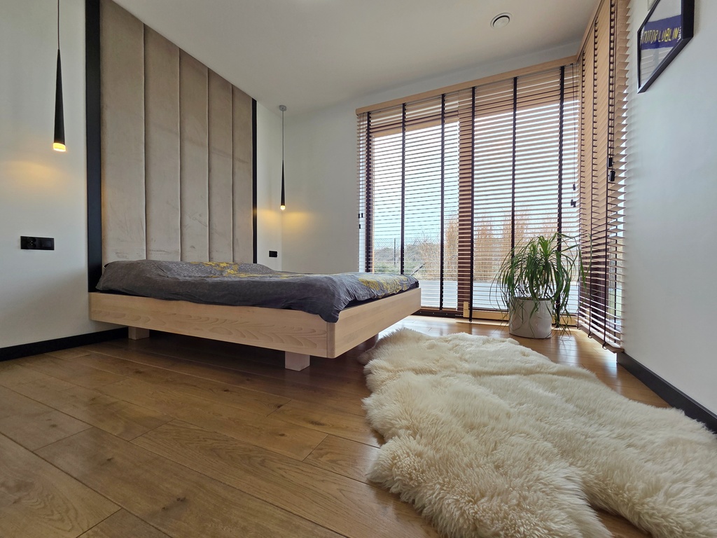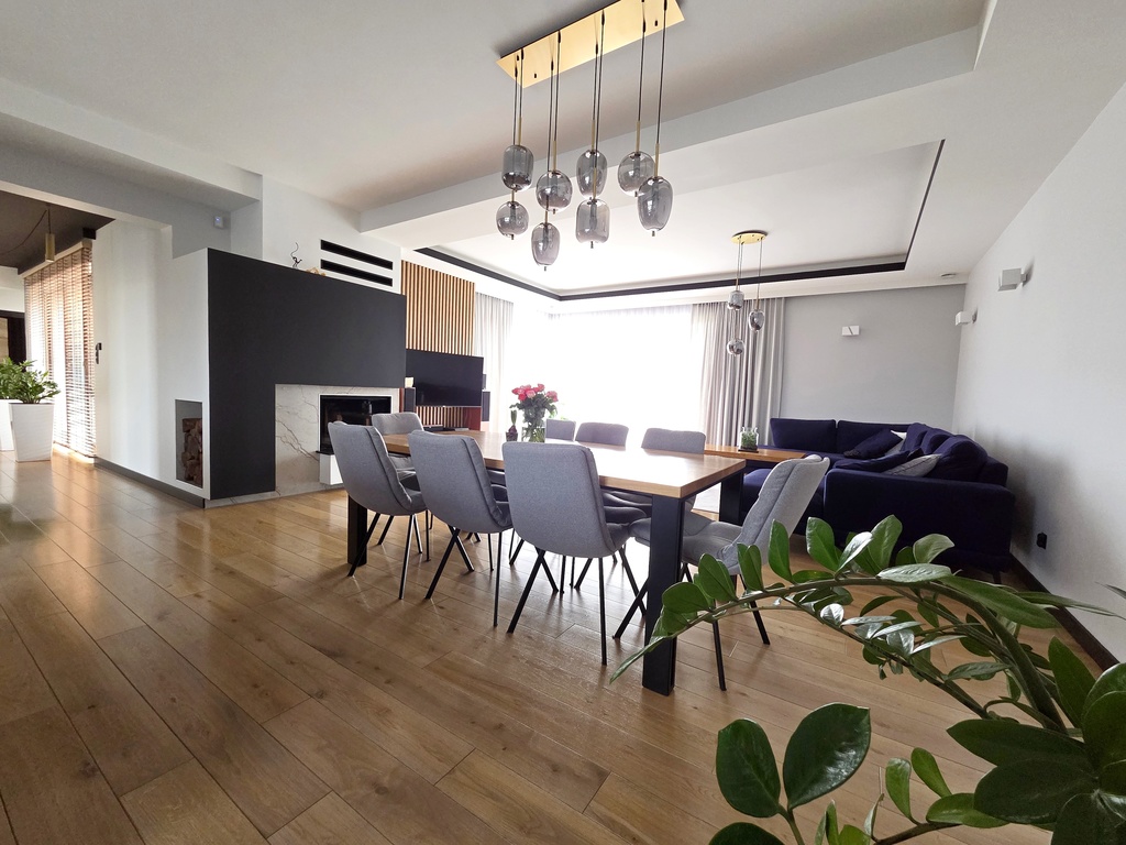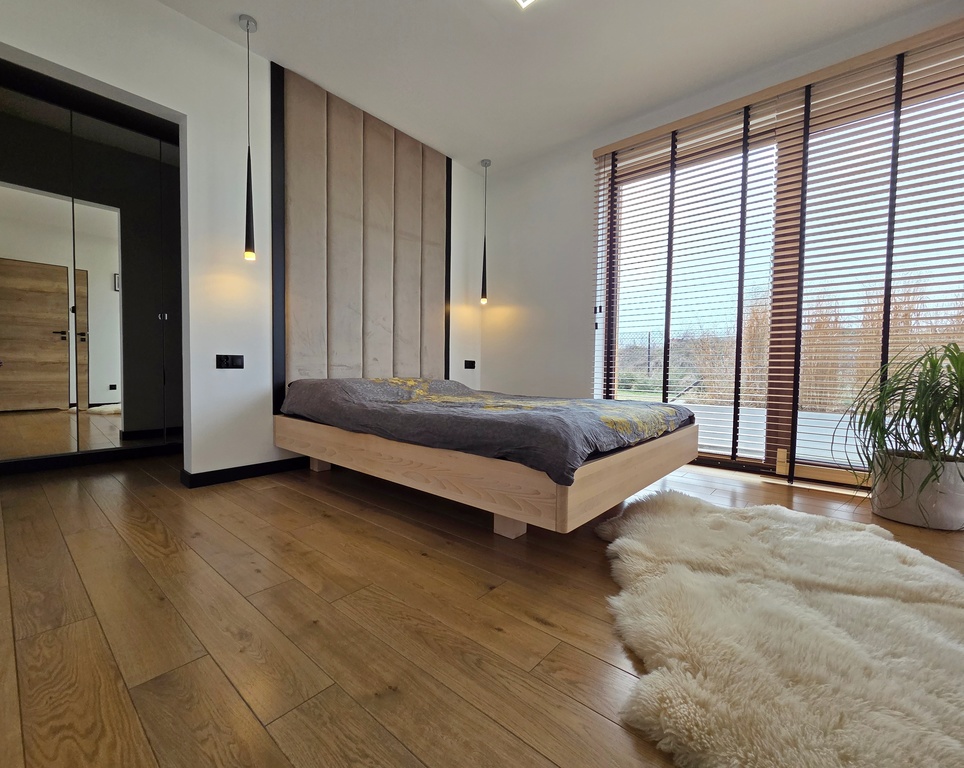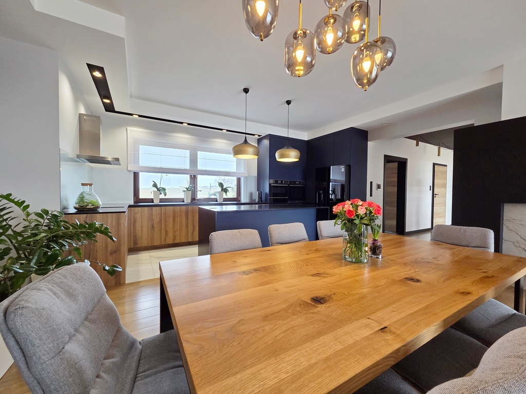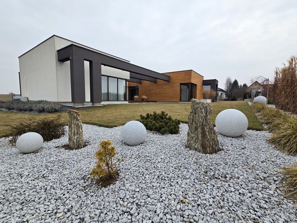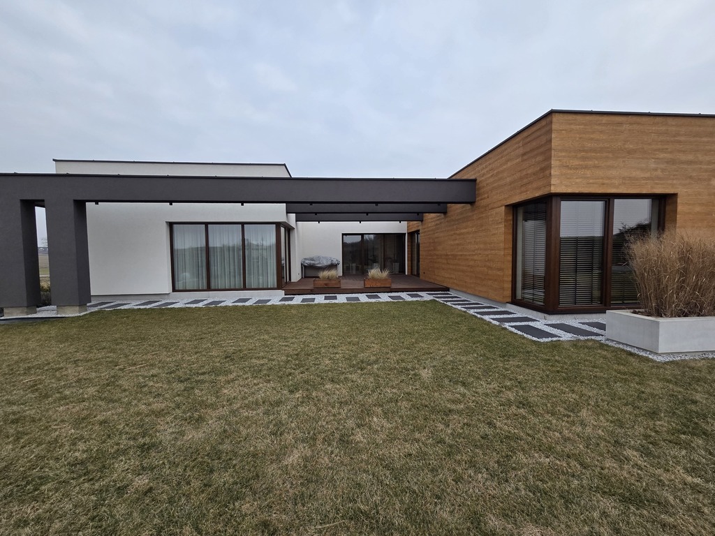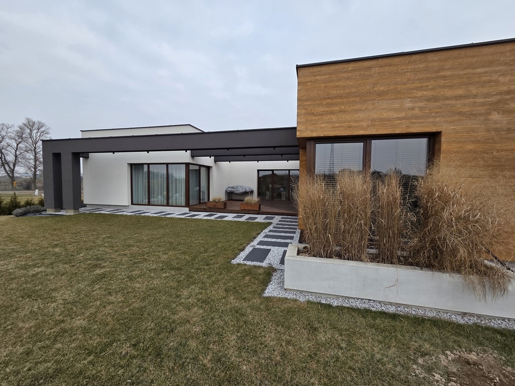 Budynek nowoczesny, parterowy o funkcjonalnie oddzielonej przestrzeni dziennej [ponad 50 mkw] od strefy prywatnej.
