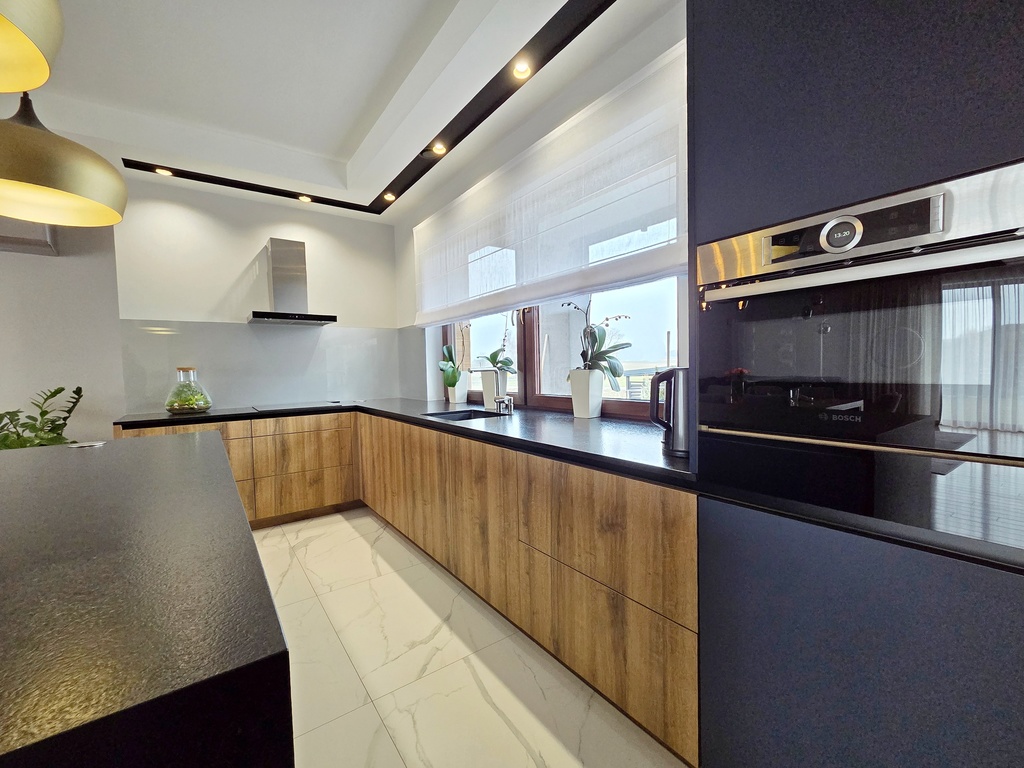 Kuchnia z pełną zabudową dużego AGD, blatem granitowym oraz funkcjonalną wyspą.
