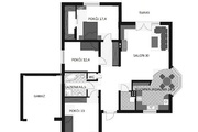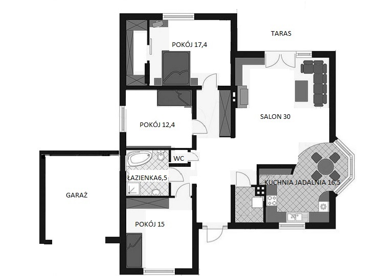 Dom składa się z salonu, jadalni, kuchni, trzech sypialni, łazienki, pomieszczenia gospodarczego, garażu dwustanowiskowego.