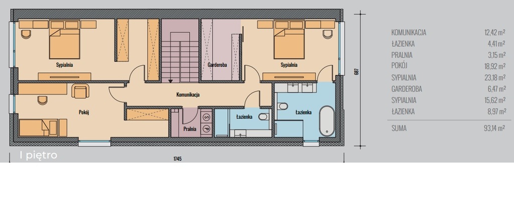 Na piętrze (93.14 m²) znajdują się: sypialnia master bedroom, z łazienką i garderobą, dwie sypialnie, łazienka, pralnia oraz hall.