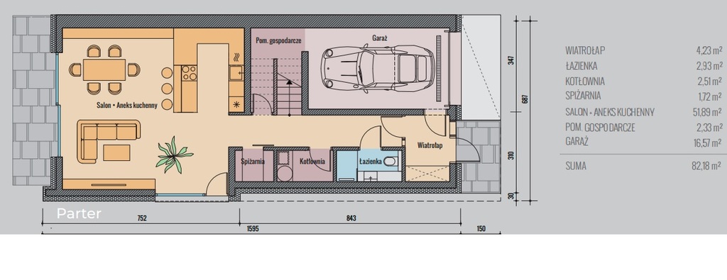 Na parterze (82.18 m²) znajdują się: salon z aneksem kuchennym (ok.52 m²), łazienka, kotłownia, spiżarnia, pomieszczenie gospodarcze, wiatrołap oraz garaż.