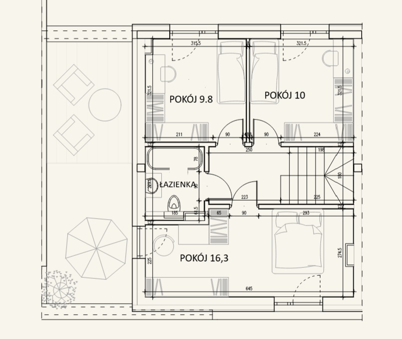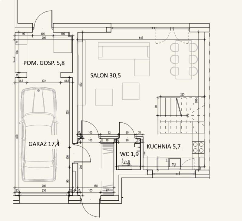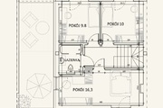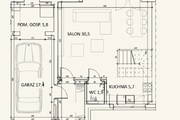 Dom składa się z: Parter- salon, kuchnia, WC, pomieszczenie techn. Piętro- trzy pokoje, łazienka. Strych.