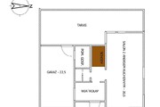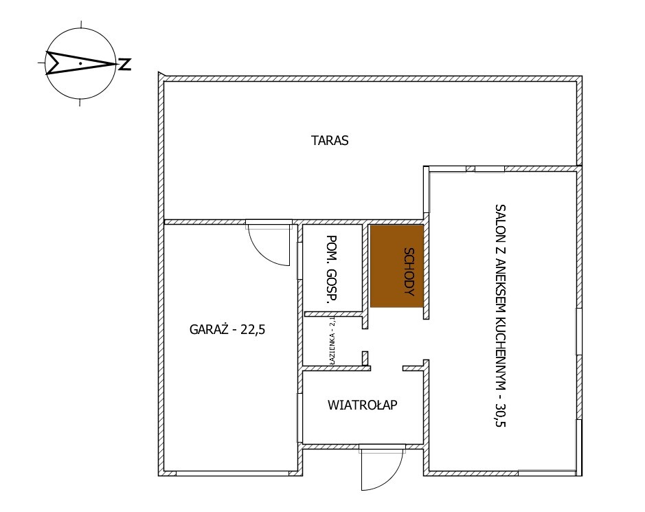 Na parterze znajduje się część dzienna, łazienka i garaż.