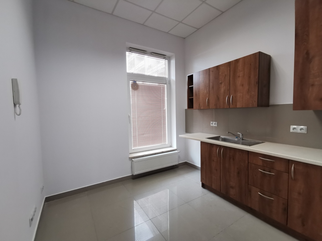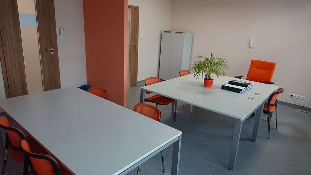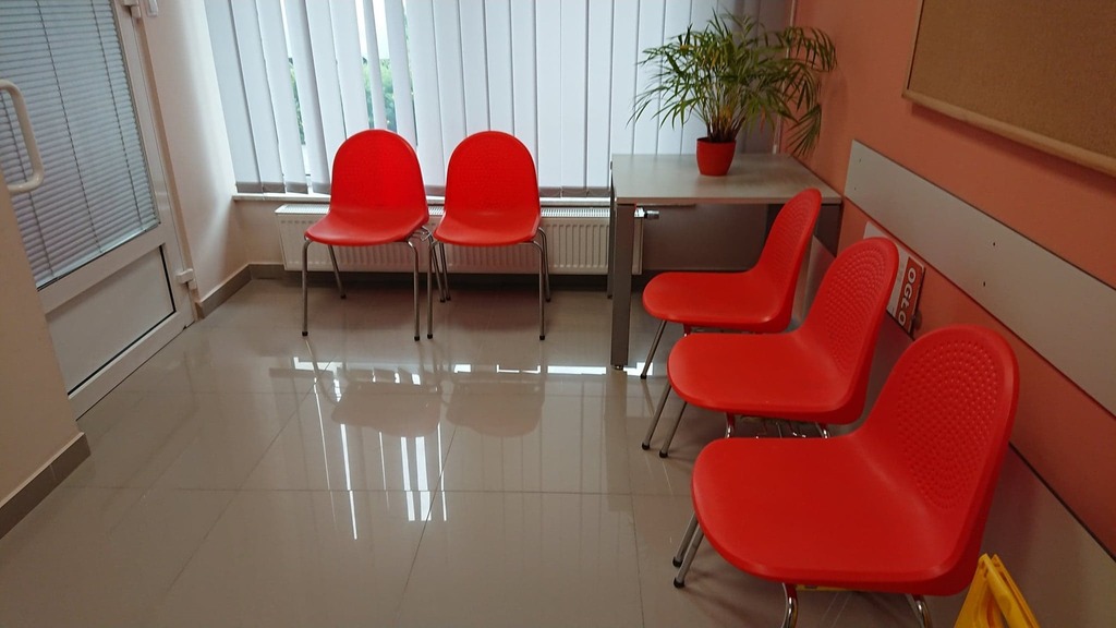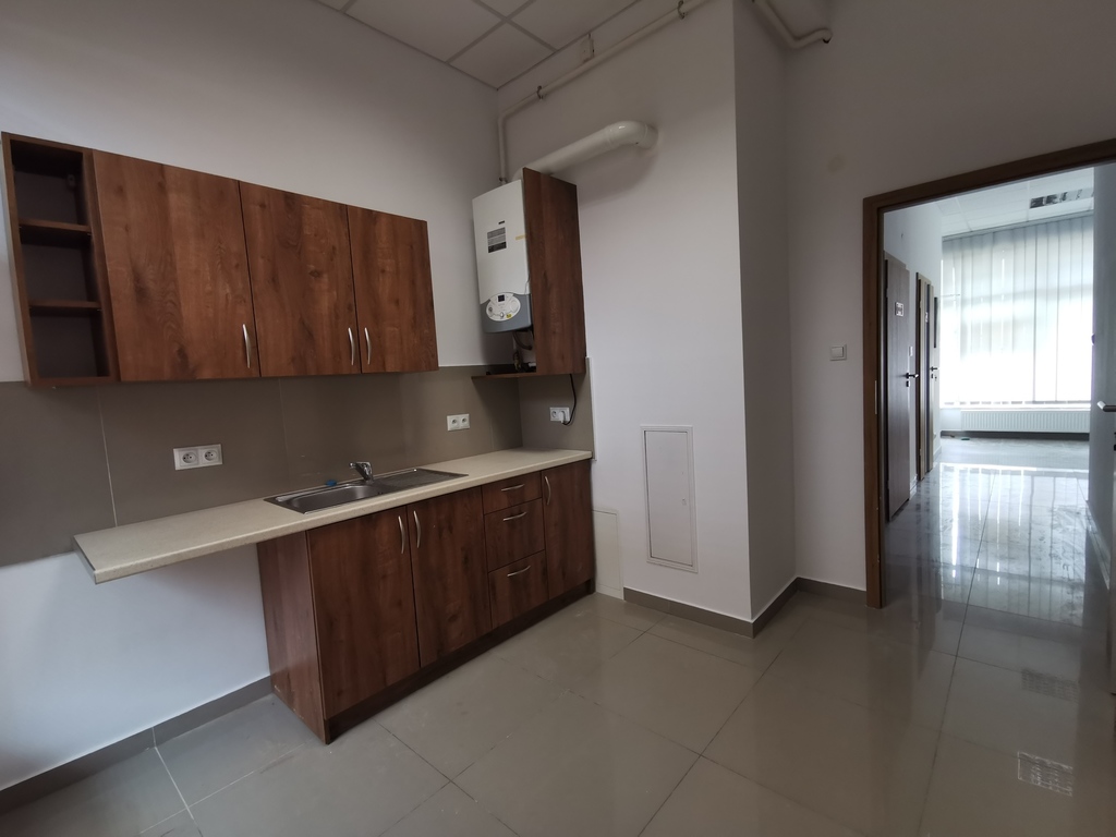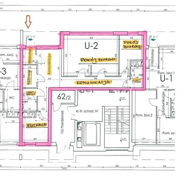 Obecnie wydzielone zostały 3 gabinety, poczekalnia, kuchnia oraz łazienka. Wszystkie ścianki są działowe, lekkie.