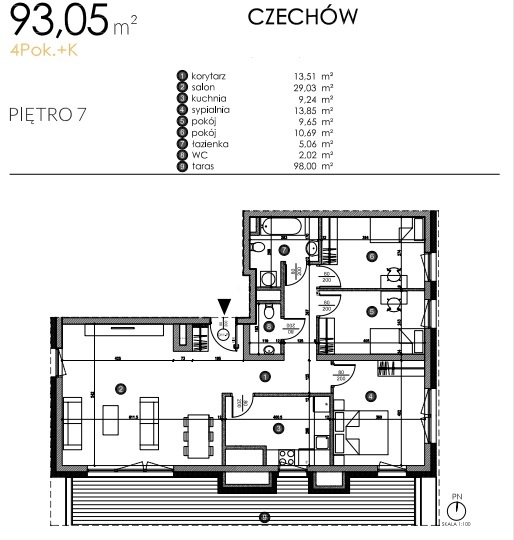 Apartament o powierzchni 93,17mkw, składa się z salonu, kuchni, trzech sypialni, łazienki, WC, przedpokoju.