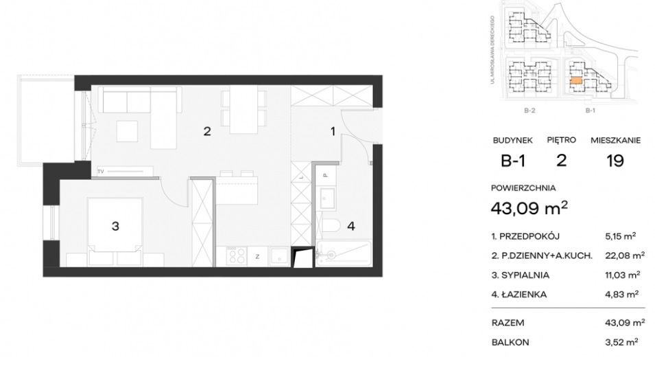 Mieszkanie o powierzchni 43,09mkw, składa się z: