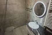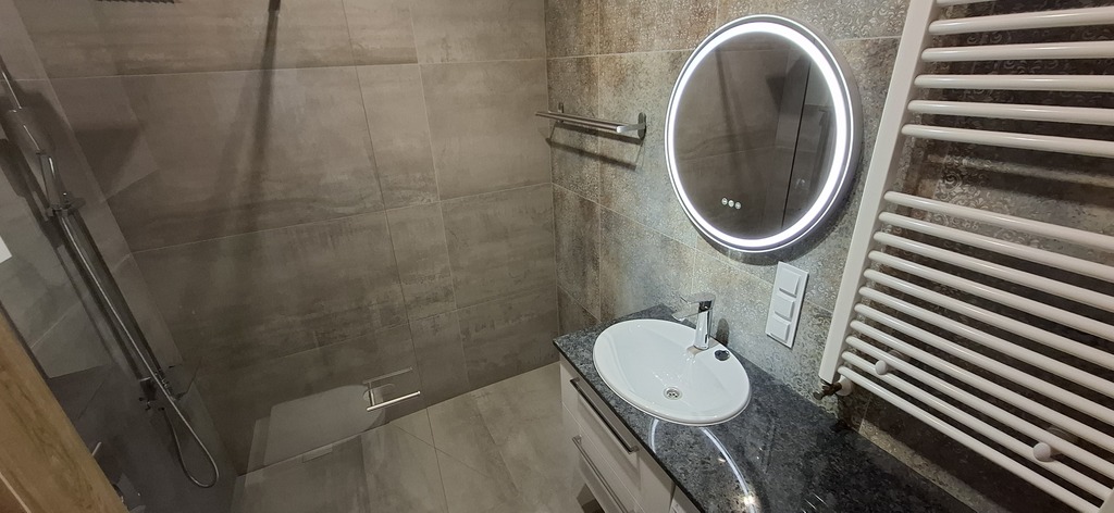 Na podłogach panele, terakota, ściany gładź, glazura.