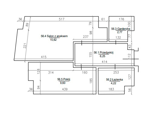 Mieszkanie o powierzchni 38,5mkw składa się z: przestronnego salonu z aneksem kuchennym, sypialni, łazienki z WC, garderoby oraz przedpokoju.