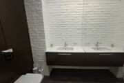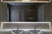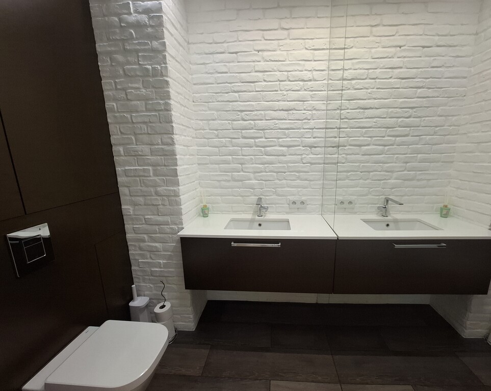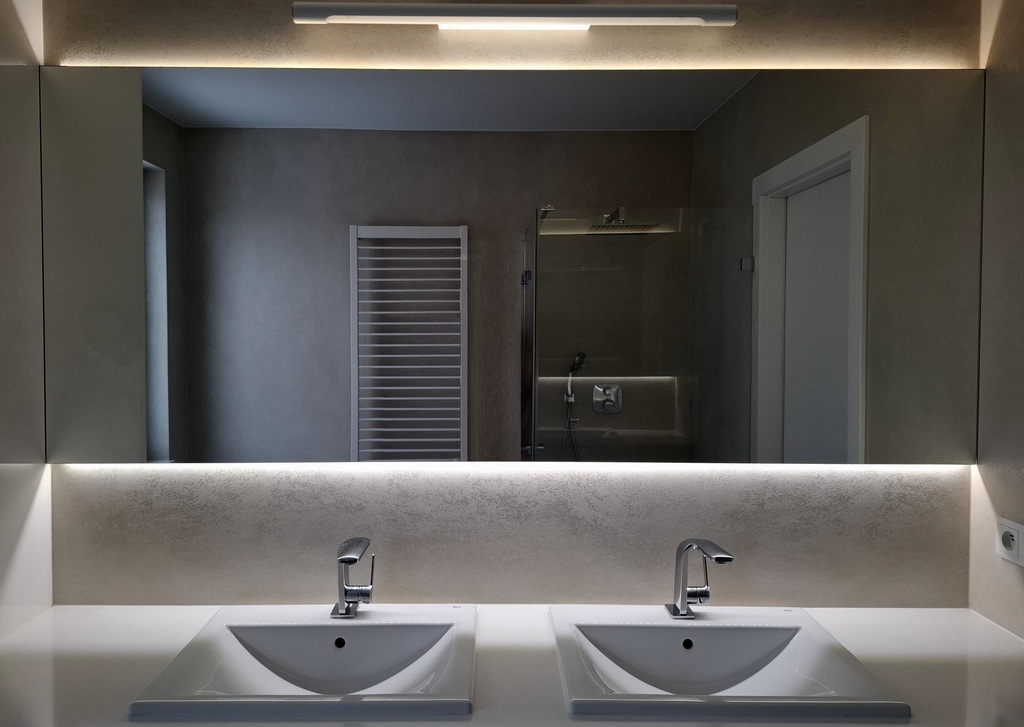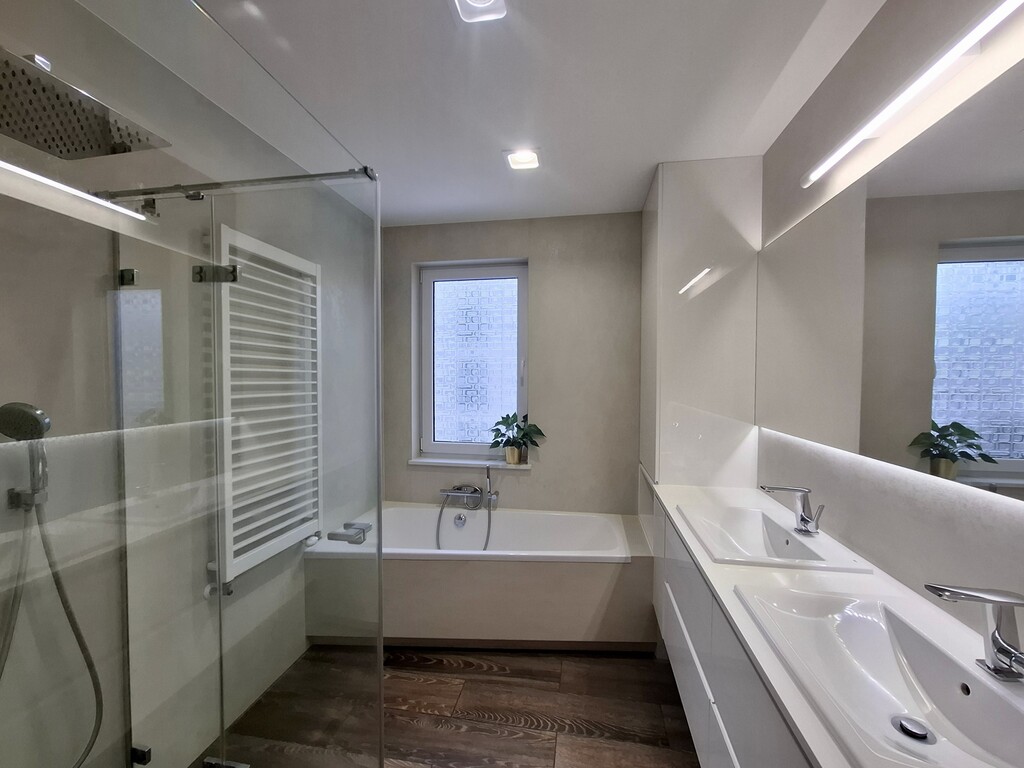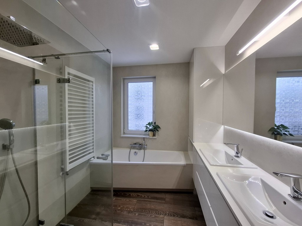 widna łazienka z prysznicem, wanną, dwoma umywalkami