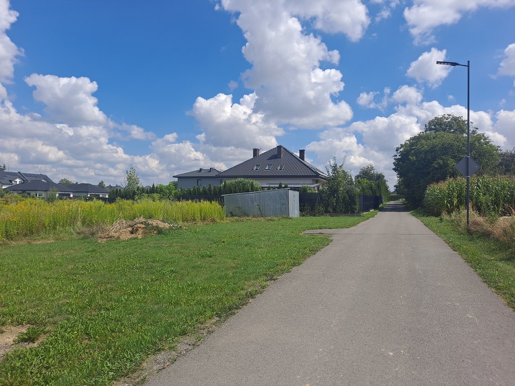 Dojazd do działki drogą asfaltową. Latarnie w ulicy.