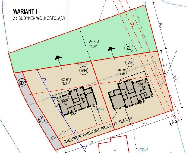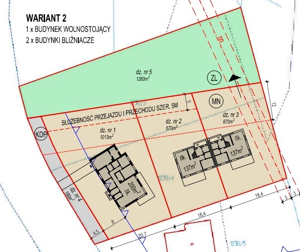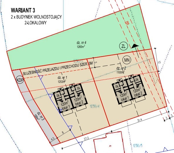 2) jedną działkę pod zabudowę wolnostojącą i dwie działki pod zabudowę bliźniaczą
